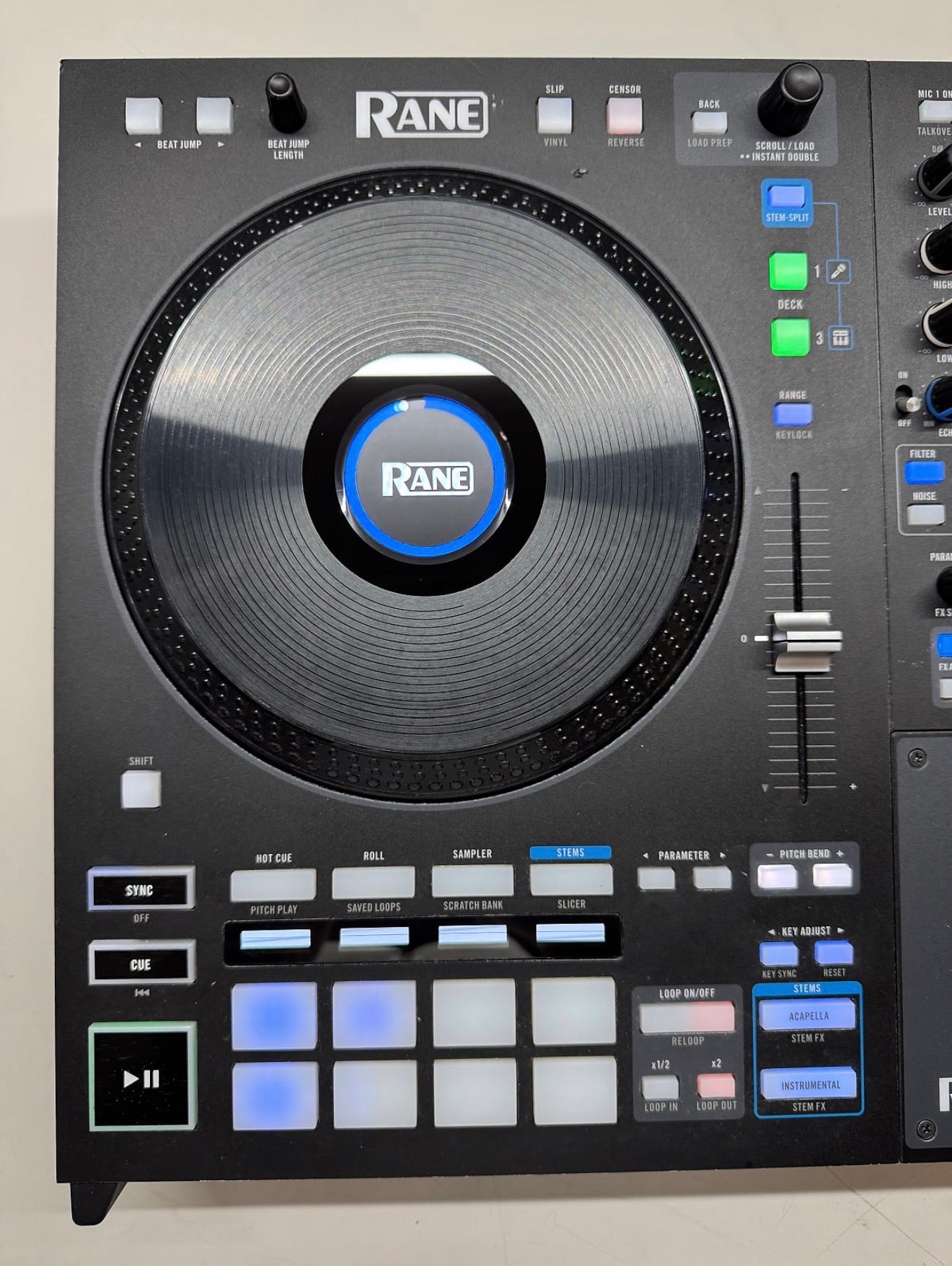 The Rane FOUR 4-Channel DJ Controller is a professional controller. Featuring large high-resolution jog wheels, precision controls, and dedicated hardware FX. With four full mixer channels, advanced stem controls, and extensive input/output options, this controller is ideal for complex mixing, live mashups, and creative performances.